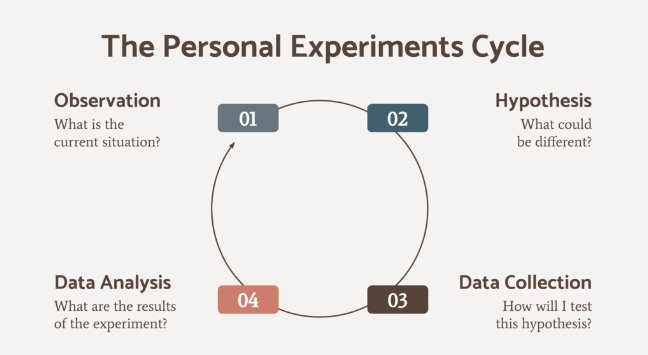 文章强调,个人实验的最大好处在于它不以失败为终结,而是将所有结果视为学习和自我探索的机会。个人实验的过程包括四个步骤:评估现状、提出研究问题、检验假设和分析结果。这种方法鼓励灵活性、创新、减轻压力,并增强决策力。