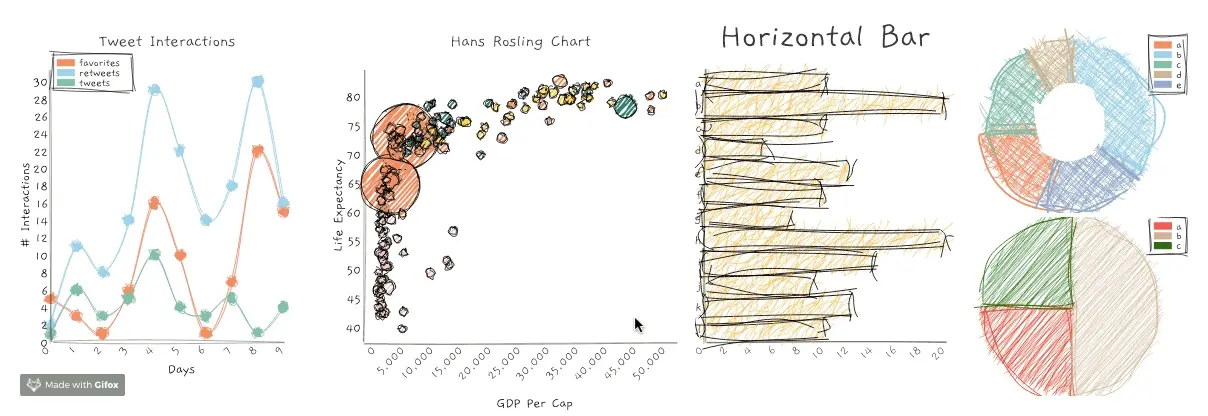 roughViz.js 是一个可重复使用的 JavaScript 库,用于在浏览器中创建基于 D3v5、rough.js 和 handy 库的多种图表类型,包括条形图、水平条形图、甜甜圈图、折线图、饼图、散点图和堆叠条形图等。