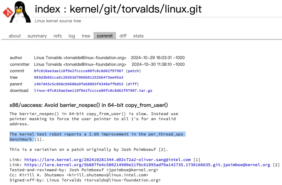 Linus:我略微出手修改几行内核代码就提升了2.6%性能