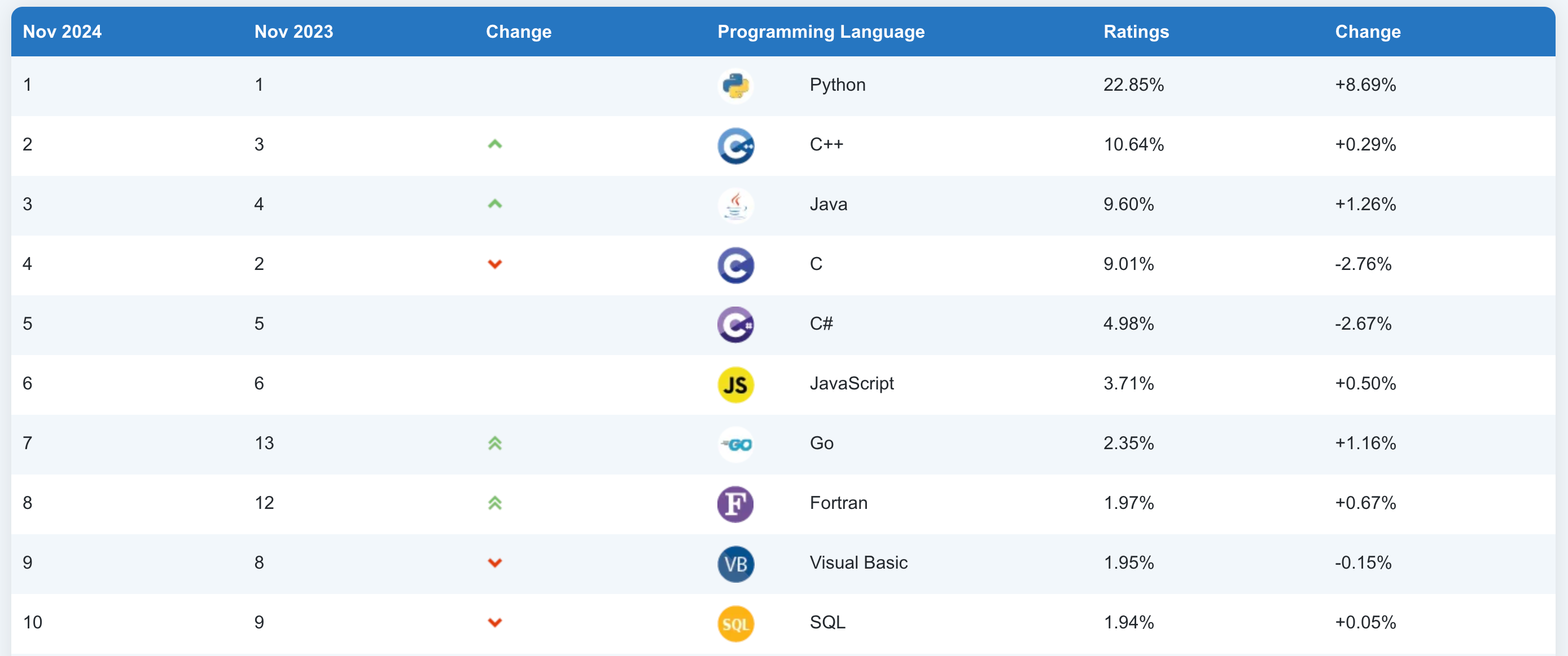 2024年11月TIOBE指数显示,Go语言排名上升至第7位,创历史新高。Go以其快速、易部署和学习的特点在编程语言中突出。Python以22.85%的评分位居榜首,C++、Java和C紧随其后。Go语言的下一个挑战是超越排名第六的JavaScript,根据趋势预测未来三年内可能实现这一目标。