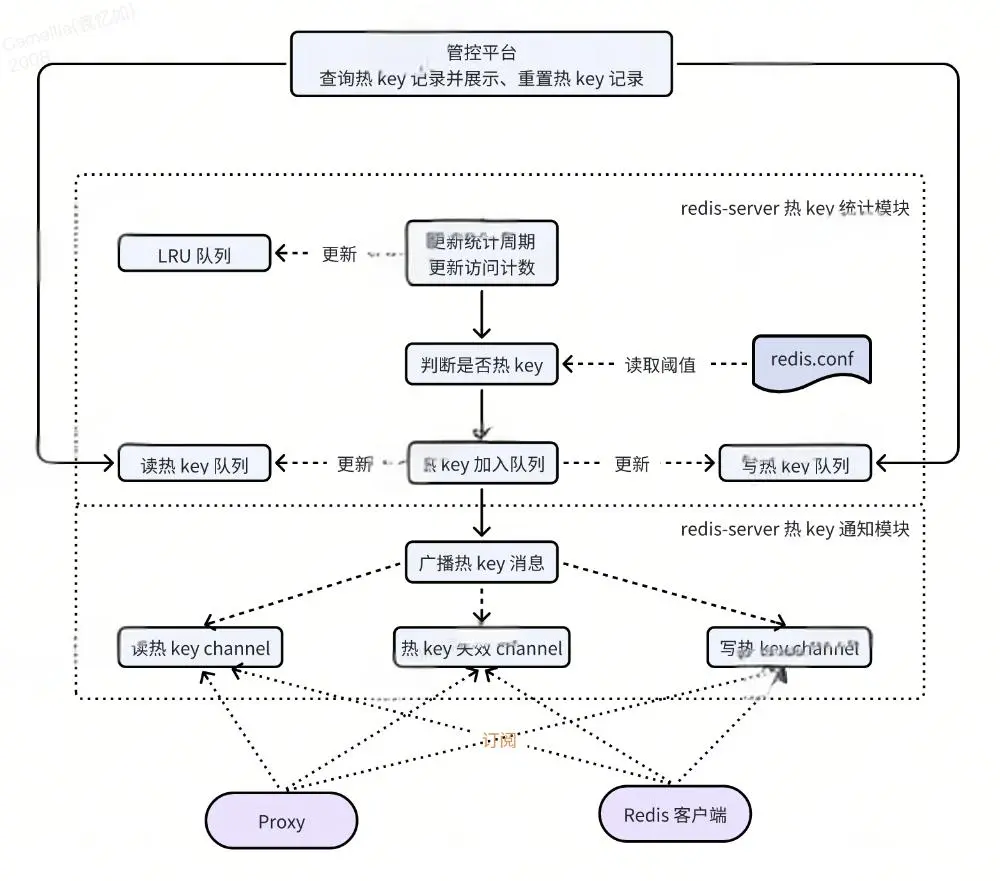 得物技术提出了一种基于Redis内核的热key统计方案,该方案实时性强,信息详细,支持订阅与查询功能,有效解决了热key探测的难点。方案包含热key统计和通知模块,能在Redis-server端实现。热key统计模块基于LRU队列,统计key每秒访问次数,超过阈值则判定为热key,同时区分读热key与写热key。热key通知模块提供读热key、写热key、热key失效三个订阅通道,Redis-server会主动向订阅通道广播热key消息。此外,还支持热key记录查询与重置命令,允许查询和重置读命令和写命令的热key日志。这一方案为热key探测提供了一种新的解决方案,有助于提高Redis的性能和稳定性。