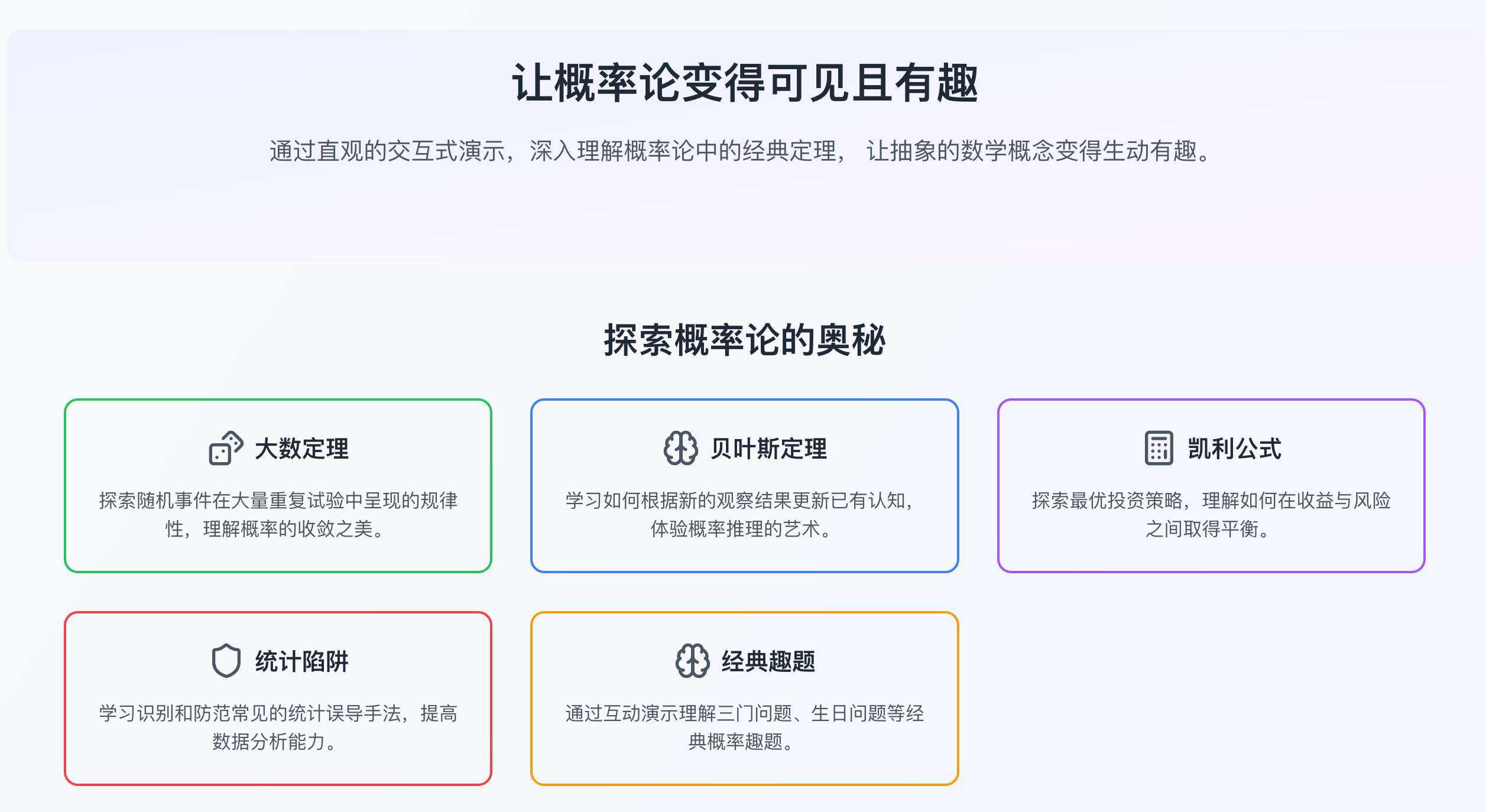 交互式学习平台,通过直观演示和实际案例,使概率论的学习变得有趣和易于理解。平台涵盖了大数定理、贝叶斯定理、凯利公式等核心概念,并提供了经典概率趣题的互动演示。