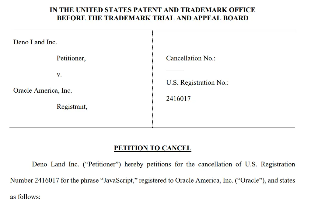 Deno 请求美国专利商标局撤销 Oracle 的 “JavaScript” 商标