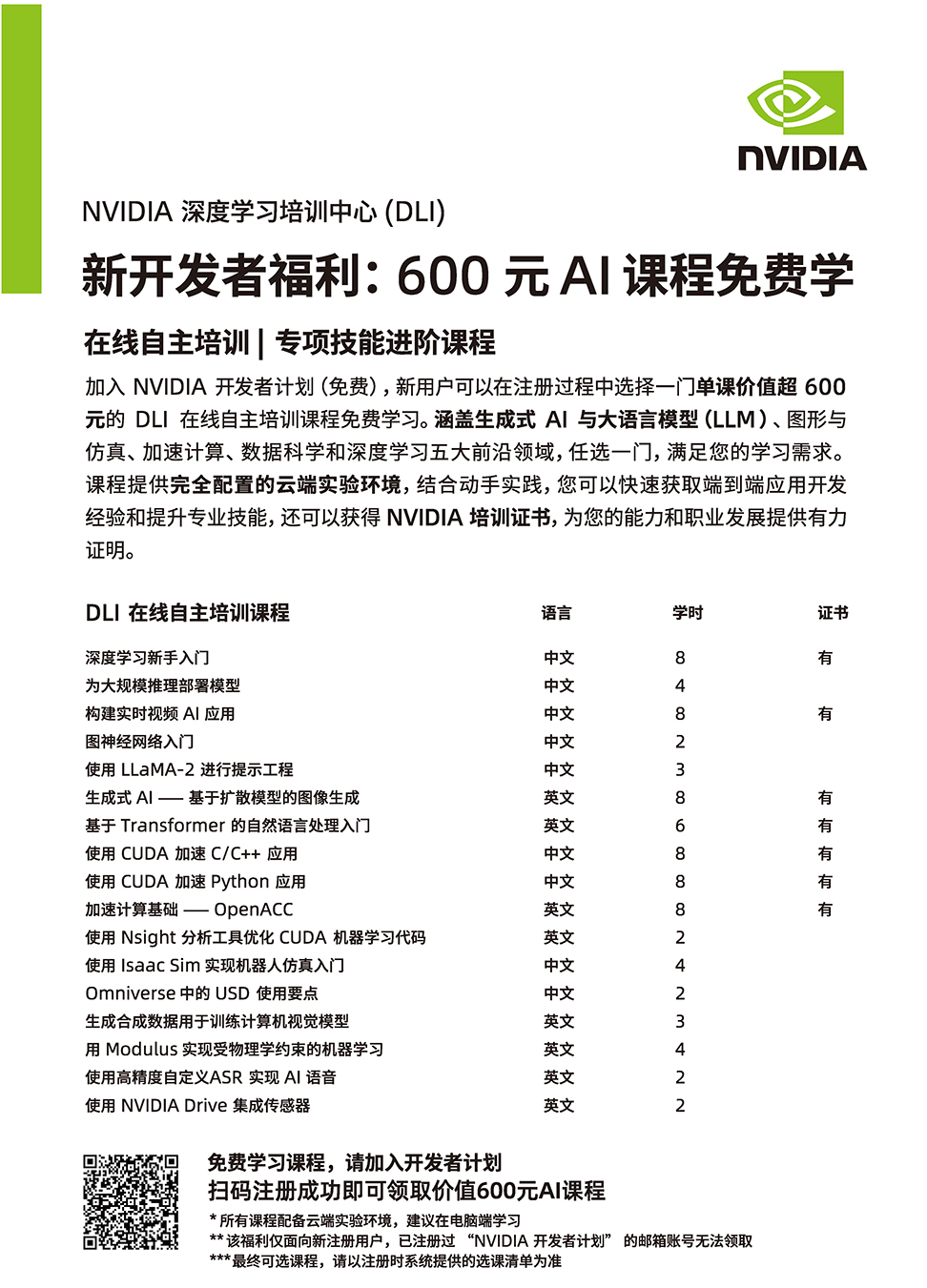 NVIDIA 新开发者福利:600元AI课程免费学,还有机会获得NVIDIA培训证书