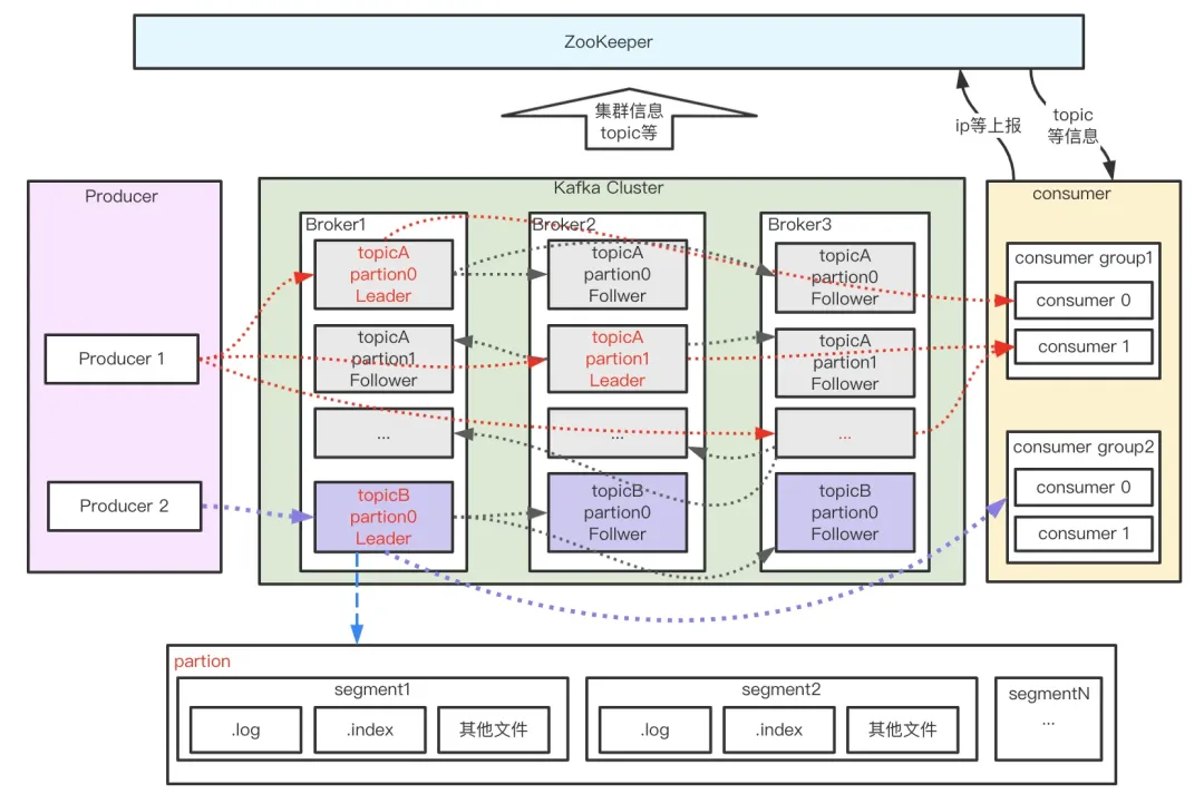 Kafka由Producer、Broker、Consumer和ZooKeeper组成。Producer负责消息的创建和发送;Broker负责消息的持久化和中转;Consumer从Broker拉取并消费消息;ZooKeeper负责集群元数据管理。Kafka通过主题(Topic)、分区(Partition)、分段(Segment)和位移(Offset)等概念,优化了消息处理的并行性和可靠性。