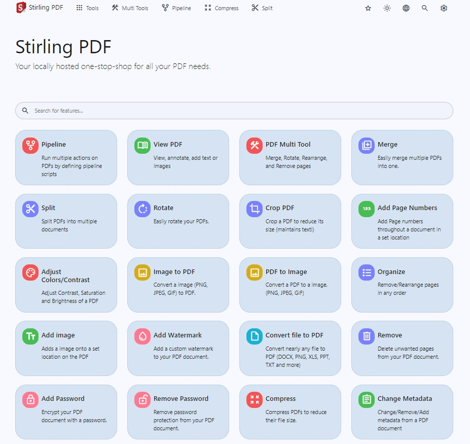 Stirling-PDF是一个本地托管的基于Web的PDF操作工具,使用Docker部署。它支持PDF文件的分割、合并、转换、重组、添加图片、旋转、压缩等多种操作。该工具完全在本地运行,不进行任何外发记录或跟踪,所有文件和PDF在任务执行期间仅存在于服务器内存中或临时文件中,并在下载后从服务器删除。它提供了丰富的特性,包括暗模式支持、自定义下载选项、并行文件处理和下载、API集成等。