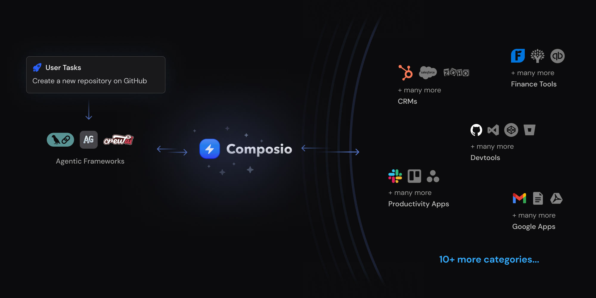 Composio是一个为AI代理提供生产就绪工具集的开源项目,旨在简化AI代理与各种工具和框架的集成。它支持100多种工具,提供管理授权、提高准确性、可嵌入和可扩展性等特点。项目提供了详细的Python和JavaScript入门指南,以及丰富的示例和文档。