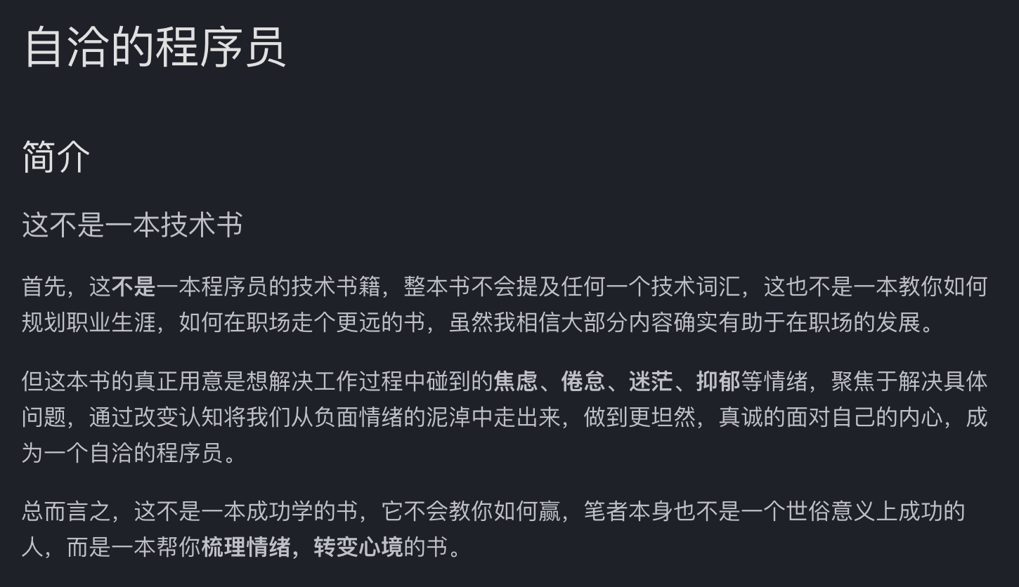 一本聚焦于程序员情绪管理和心态调整的书籍,旨在帮助程序员解决工作中的焦虑、倦怠、迷茫、抑郁等情绪问题,实现内心的自洽。