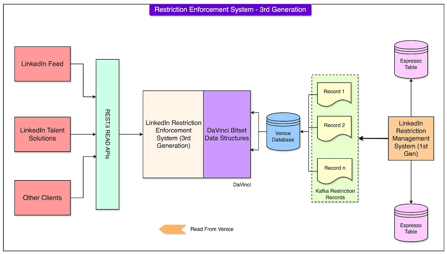 为应对高QPS、超低延迟和高可用性的需求,LinkedIn迁移到自建的Espresso分布式NoSQL系统,并与Kafka集成,实现实时数据同步。这一代系统通过水平扩展和内存查找显著提升了性能,但也面临重启时数据加载耗时和大规模增长处理的挑战。第三代系统进一步优化,采用堆外内存存储数据,减少垃圾回收(GC)事件对性能的影响。同时,引入Venice和DaVinci框架,通过预加载限制数据到内存并使用高效的bitset数据结构,实现了更快的启动过程和更强的弹性。
