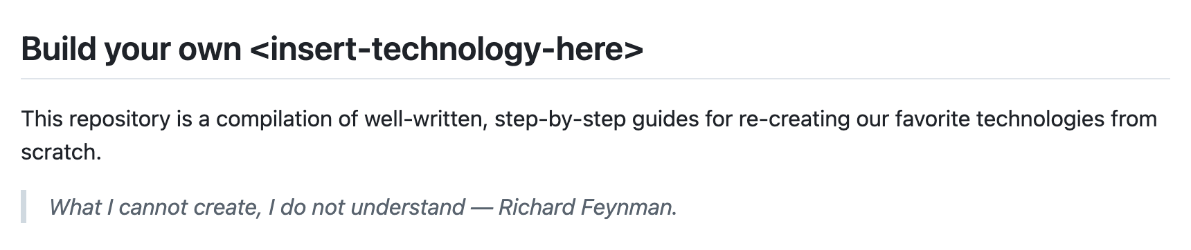 集合了众多从零开始构建各种技术项目的教程的仓库。这些技术项目包括3D渲染器、区块链、数据库、操作系统、编程语言等众多领域,旨在通过实践学习帮助人们深入理解这些技术的内部原理和实现过程。