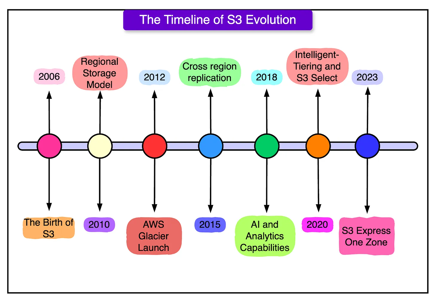 S3的演变历程包括从全球模型到区域模型的转变、引入Glacier、增强性能和安全性、集成AI和分析能力、推出智能分层和S3 Select等功能。S3的持久性和高可用性得益于多可用区存储、自动扩展和AI驱动的预测性扩展策略。通过这些技术,S3成为支持媒体流、人工智能工作负载、实时分析和关键任务应用的基石。