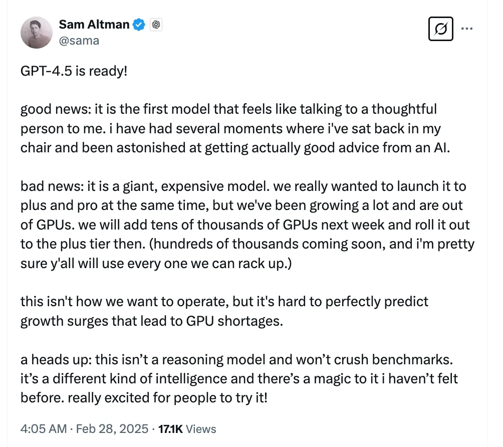 刚刚,GPT-4.5问世!OpenAI迄今最大、最贵模型,API价格飞涨30倍,不拼推理拼情商