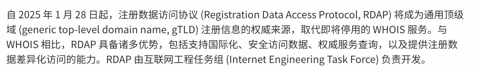 本文详细介绍了域名注册信息查询的两种主要方式——WHOIS和RDAP,以及它们在域名管理、网络安全和隐私保护中的应用和演变。WHOIS是一种传统的查询协议,允许用户通过查询域名注册数据库获取注册人信息、注册时间和到期时间等详情。然而,WHOIS存在格式不统一、国际化支持有限、隐私问题等局限性。RDAP(注册数据访问协议)作为WHOIS的现代替代品,使用HTTP接口返回标准化的JSON数据,具有支持国际化、提供安全访问控制和数据格式标准化等优势。ICANN宣布自2025年1月28日起,RDAP将成为通用顶级域名(gTLD)注册信息的权威来源,取代WHOIS服务。