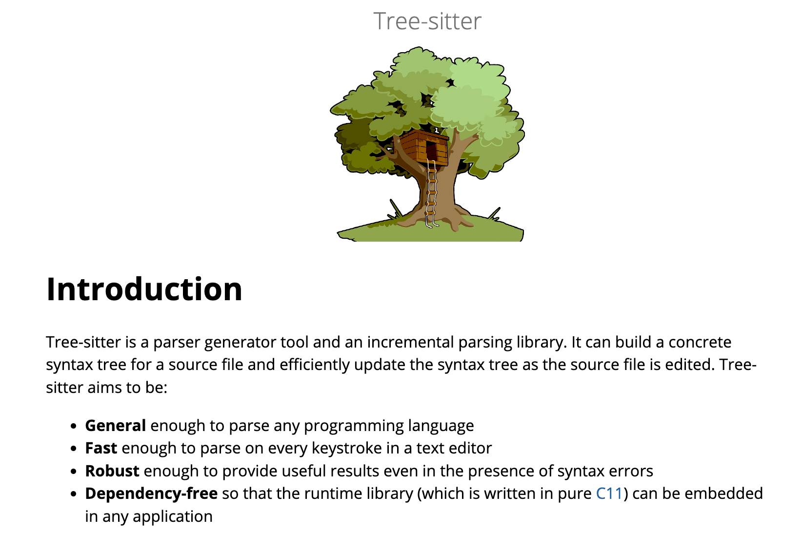 Tree-sitter 是一个解析器生成工具和增量解析库,能够为源代码文件构建具体的语法树,并在源代码编辑时高效地更新语法树。
