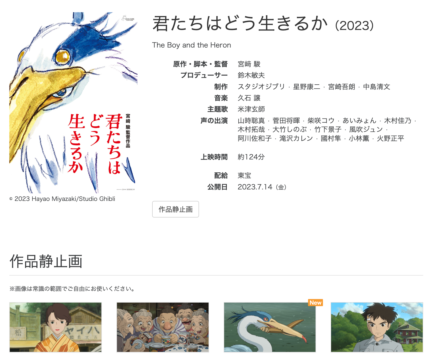 吉卜力工作室上传了其几乎所有电影的数百张高分辨率静态图片,这些图片被标注为 "仅供个人影迷使用,以进一步欣赏吉卜力工作室的电影",并呼吁人们 "请在常识范围内自由使用这些图片"。