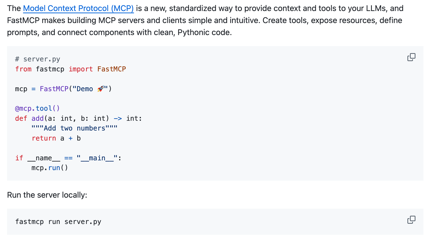 用于构建 MCP(Model Context Protocol,模型上下文协议)服务器和客户端的 Python 库。