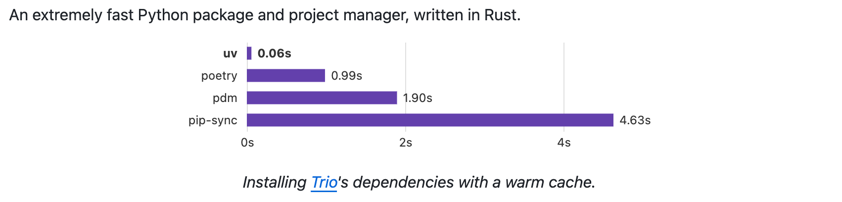 一个由Rust编写的极快速Python包和项目管理器。它集成了pip、pip-tools、pipx、poetry、pyenv、twine、virtualenv等多个工具的功能,速度比pip快10 - 100倍。它提供全面的项目管理,包括通用锁定文件、脚本运行支持、Python版本安装管理等功能。