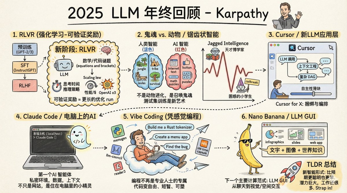 2025 年,LLM 领域迎来重大变革。强化学习从可验证奖励(RLVR)成为主流训练阶段,使 LLM 在特定领域表现出类似人类推理的策略,改变了能力提升与计算资源的关系。LLM 的智能形态被重新定义,其在可验证领域表现出色,但整体性能呈现“锯齿状”,导致传统基准测试的可靠性下降。