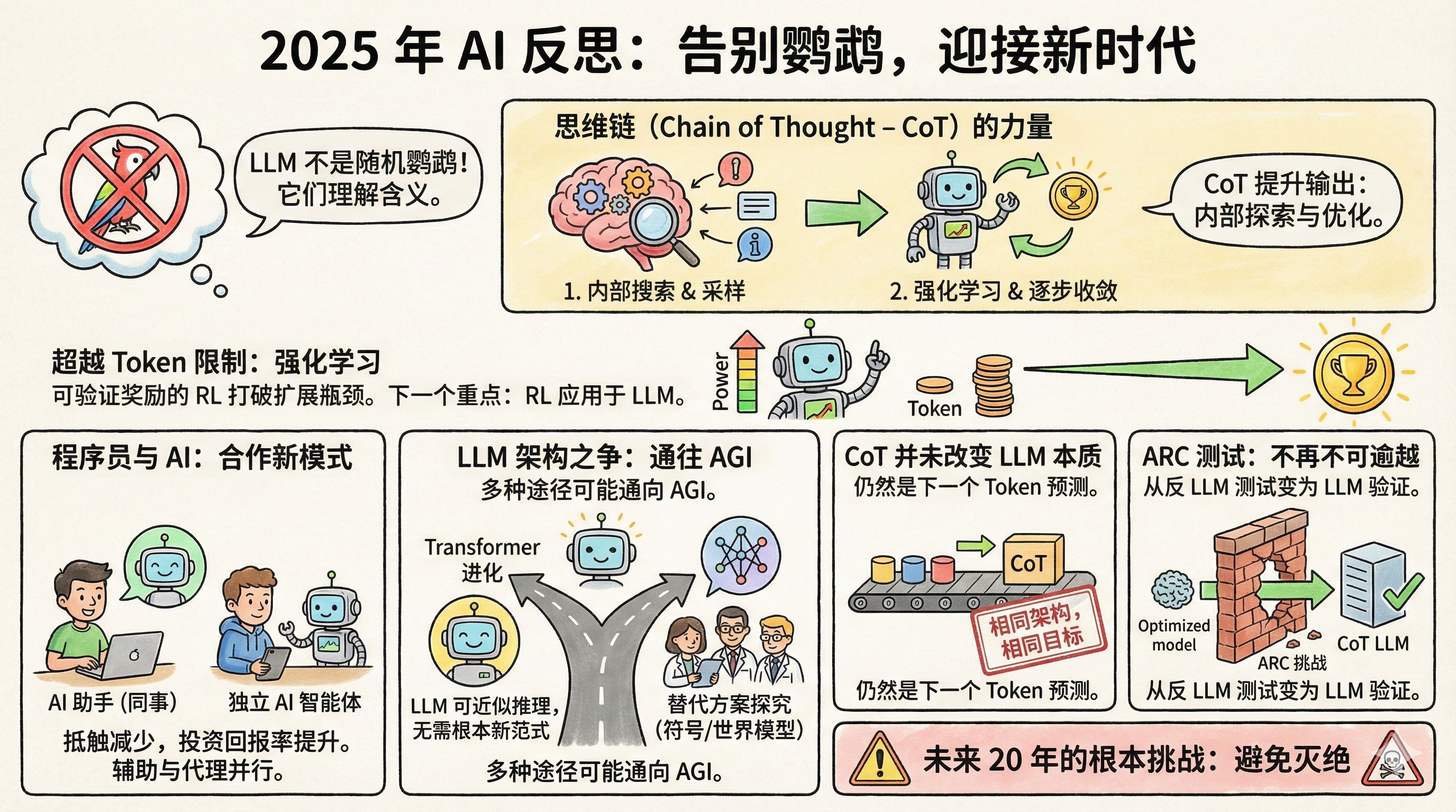程序员对 AI 辅助编程抵触降低,LLM 提供代码和提示能力提升,投资回报率获认可,编程领域出现协作伙伴与独立编码主体分化。部分科学家探索 Transformer 替代方案,但 LLM 作为可微分机器,或能独立于新范式实现通用人工智能(AGI)。CoT 未改变 LLM 本质,仍是基于相同架构生成。