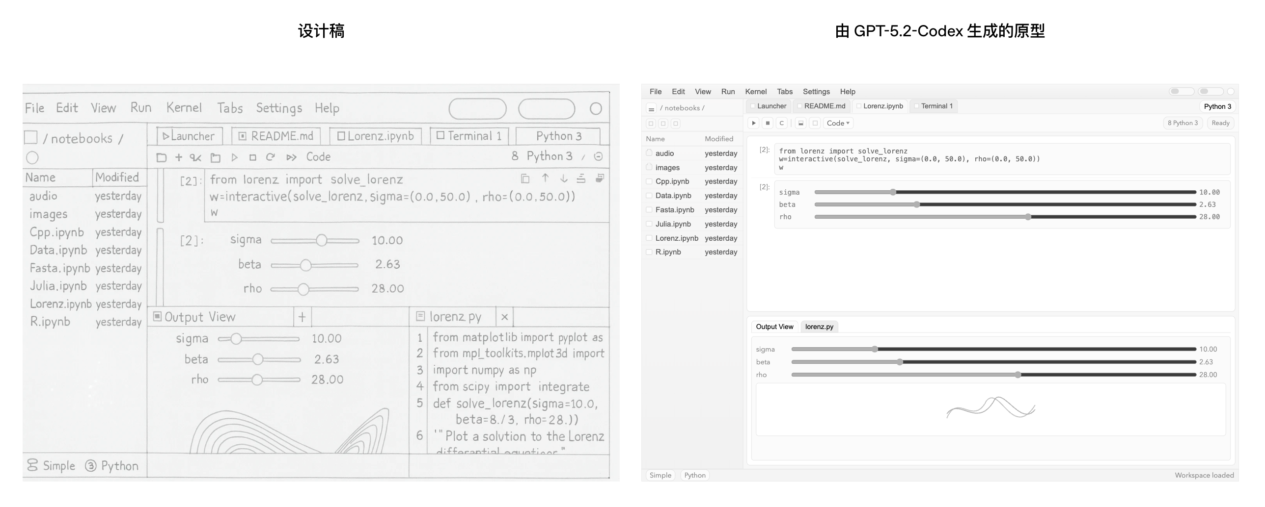 在软件工程方面,GPT-5.2-Codex 融合了 GPT-5.1-Codex-Max 的能力,在 SWE-Bench Pro 和 Terminal-Bench 2.0 测试中表现卓越,能够处理大型代码库和复杂任务,支持从设计稿到可运行原型的快速转化。