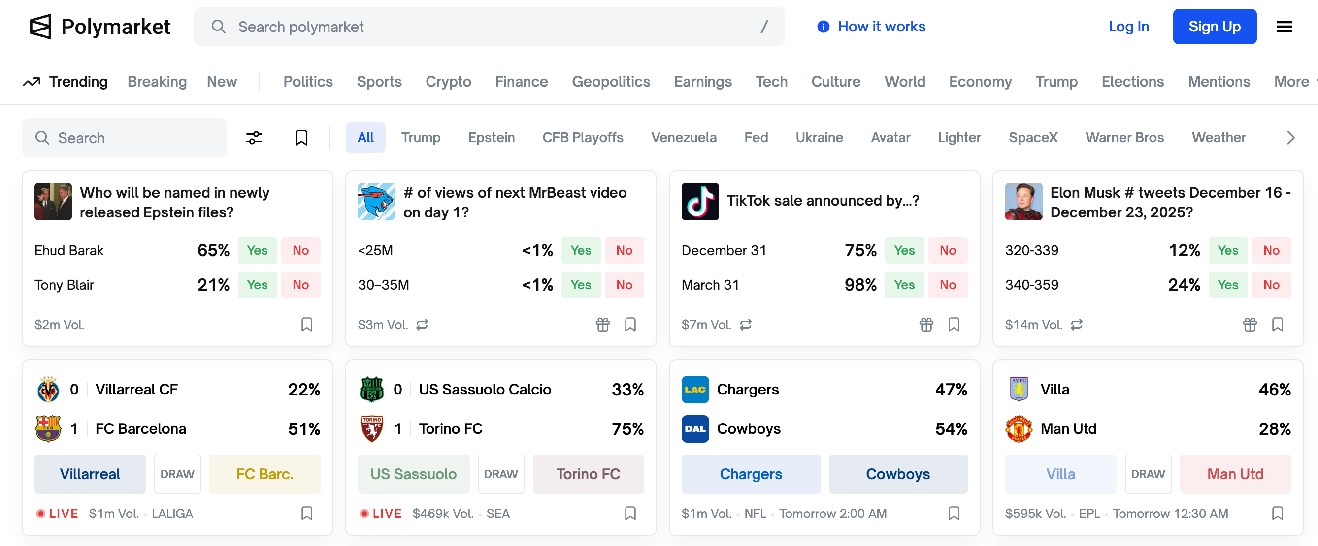 Polymarket 是全球最大的预测市场平台,涵盖多个领域。用户可对政治、体育、金融等事件进行预测交易。平台通过交易量和预测概率展示市场对各类事件的预期,为用户提供决策参考。