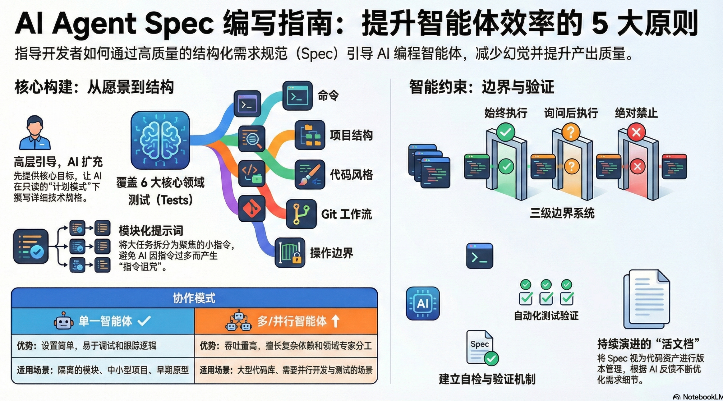 文章为开发者提供了一套编写AI智能体规范(Spec)的系统化框架,旨在解决大型项目因上下文过载导致模型失效的难题。