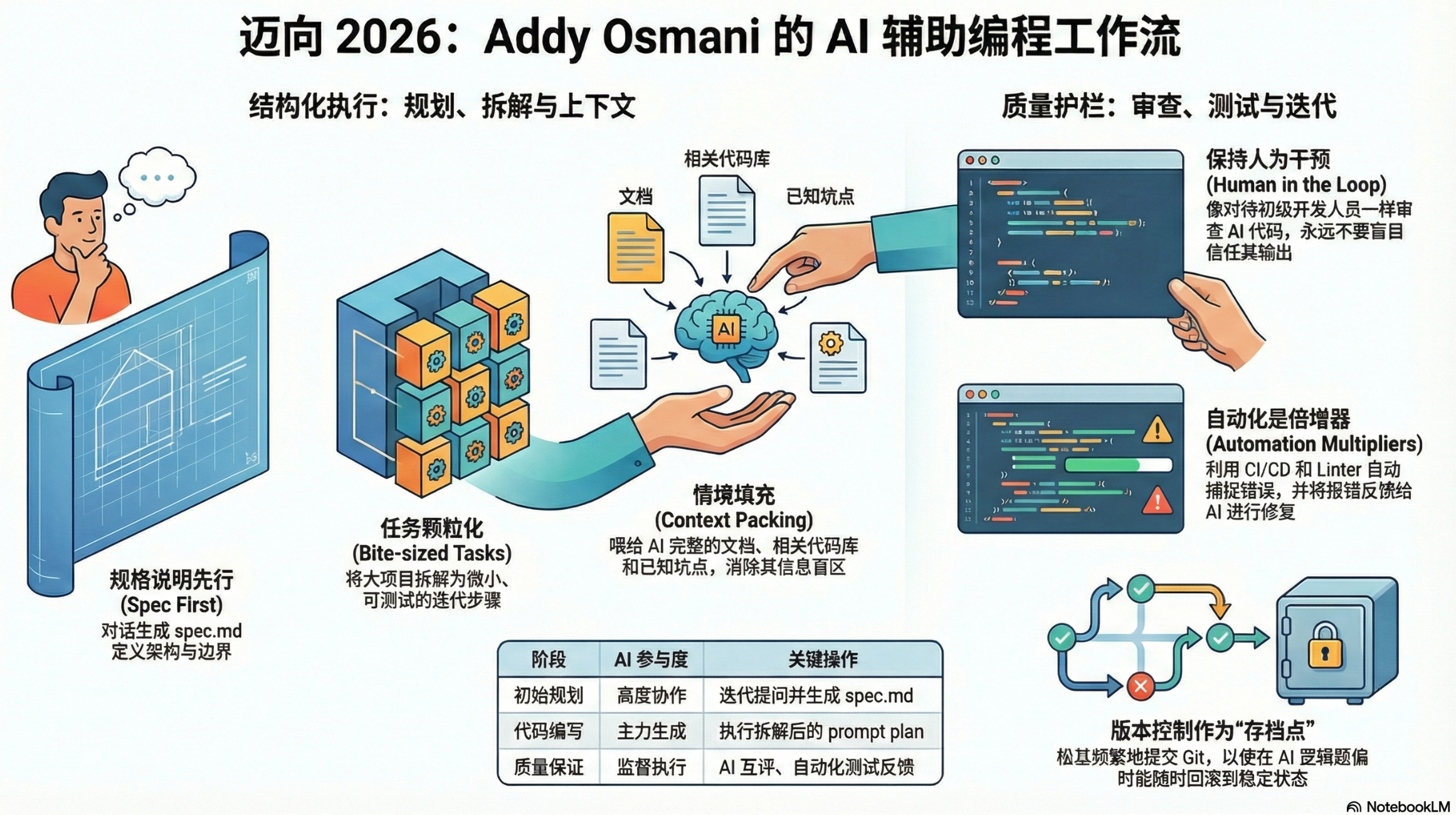 其核心架构围绕前期规划与颗粒度管理展开,提倡先通过与 AI 迭代讨论生成详细的技术规范(spec.md),再将复杂任务拆解为细小的迭代步骤。文中重点提出了上下文填充与规则定制的重要性,主张利用各种工具为 AI 提供充分的项目背景,并建立明确的代码规范文件以确保输出质量。