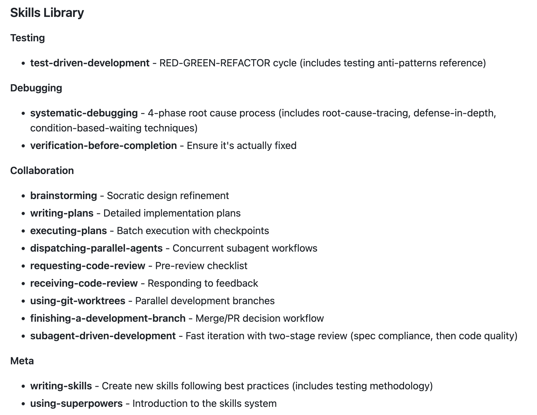 Skill合集库,涵盖了测试、调试、协作和元技能等多个方面,支持创建新技能并遵循最佳实践。