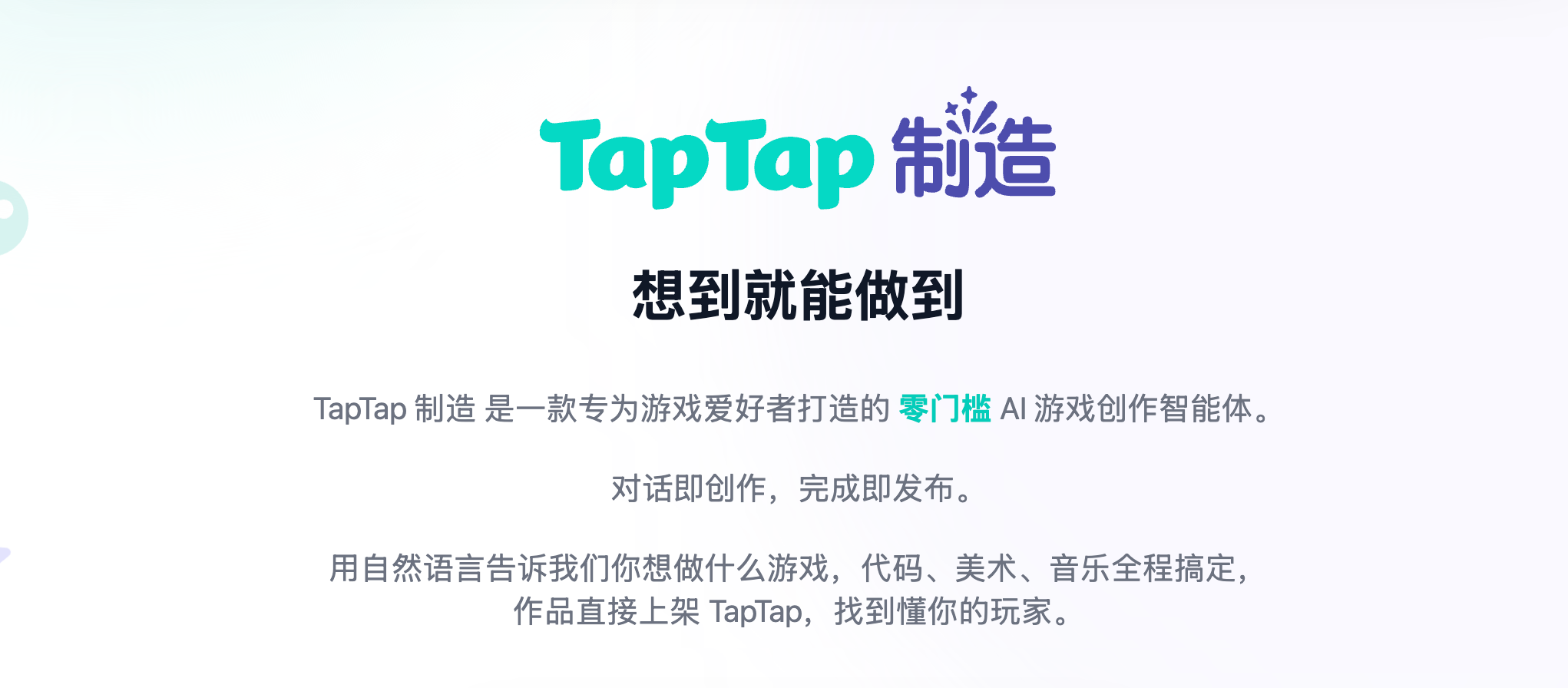 TapTap 制造是零门槛 AI 游戏创作工具,用户通过自然语言描述即可生成完整游戏,AI 自动完成代码、美术、音乐及联网功能,作品可直接上架 TapTap 平台,实现“对话即创作,完成即发布”。