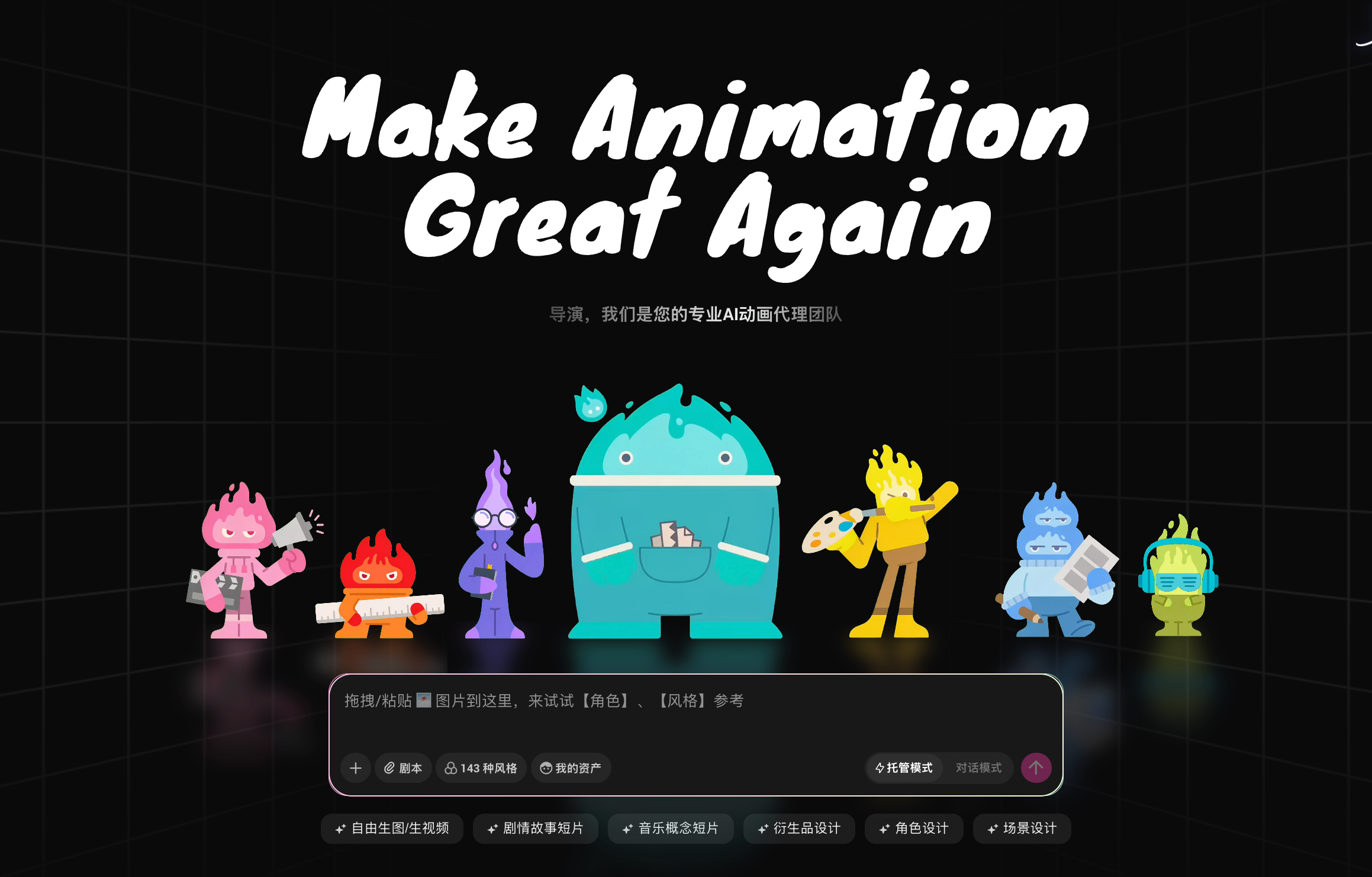以AI动画代理团队为核心,提供艺术总监与角色、风格参考能力,覆盖脚本、分镜、场景、角色、产品与音乐等制作环节,让创作者在保持创作愿景与质量负责的前提下加速动画内容生成与交付。